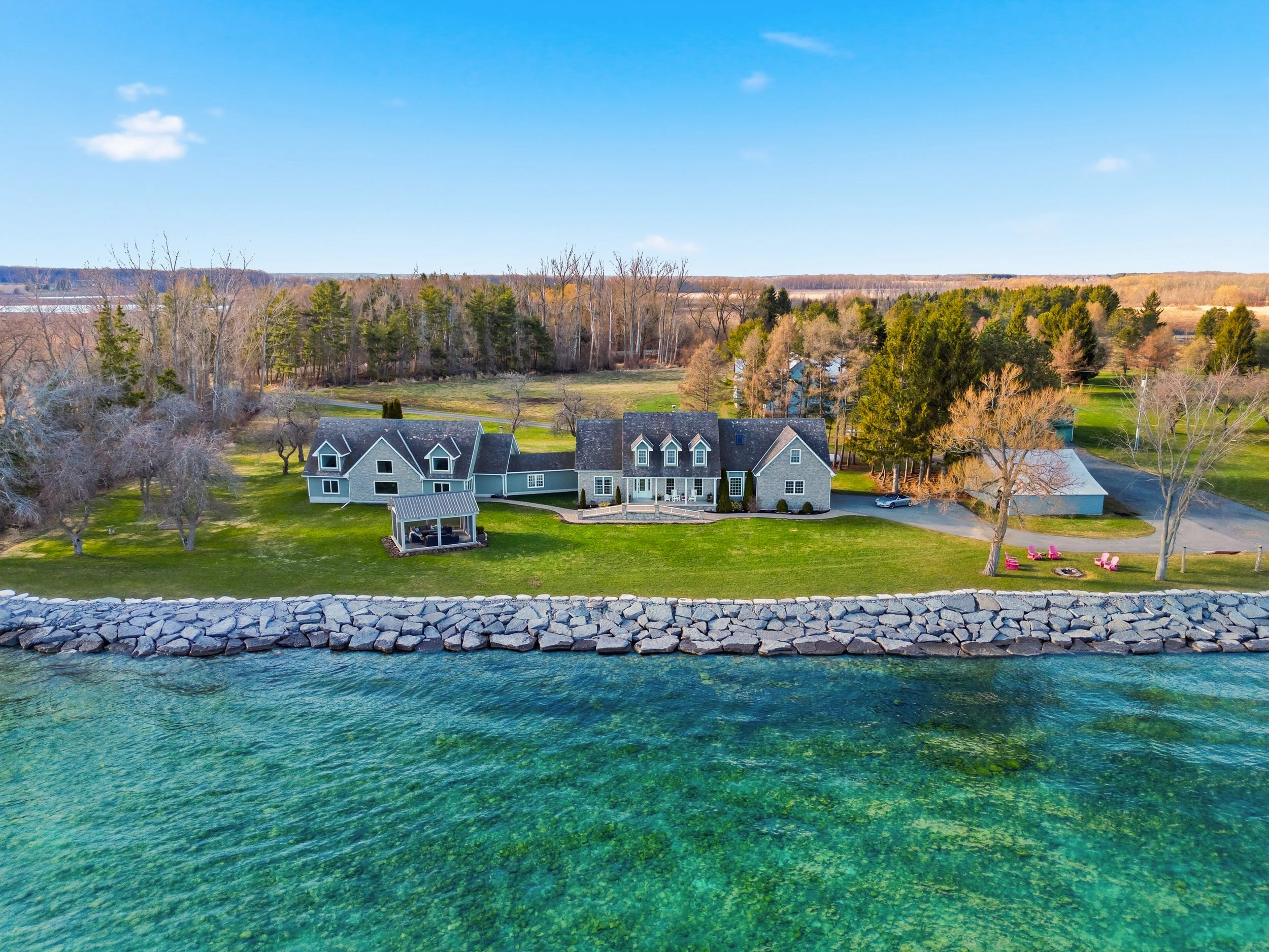 Welcome to 4698 County Road 8. This private Cressy Waterfront Estate is located on over 600 ft of Lake Ontario shoreline. Envision gathering with family and friends on more than 8 private acres, surrounding an elegant Cape Cod - style residence in lovely Prince Edward County. Masterfully situated to enjoy unobstructed Southward views of Lake Ontario, meander to a pebble beach and hardscaped shore that leads into some of the most pristine water - teeming with wildlife. The home has been tastefully renovated, providing an impressive 6,000+ sq. ft of living space for entertaining and everyday living. Inside, the home lends itself to versatile living - to gather or spread out. Feel inspired to entertain and cook in the gourmet kitchen (2024) complete with custom cabinetry, refined Dekton countertops and an abundance of storage. An inviting brick fireplace anchors the spacious living room. This level features an exquisite private primary wing complete with walk-in closet and 4 piece ensuite. A three season enclosed porch provides space for el fresco dinners. The upper level offers 2 additional bedrooms, 2 full bathrooms and expansive multi-flex room for all of your family's needs. The lower level features a private walk-out in-law suite, featuring a living room with fireplace, kitchen, full bathroom, bedroom and extra storage space. The spectacular light-filled great room with soaring ceilings is where you will host large engagements. Recently renovated (2025) to enjoy the majestic views of Lake Ontario, this space showcases an oversized wet bar, 2 pc bathroom and space to host grand gatherings. Find peace and serenity listening to the waves washing ashore in the detached screened pavilion that boasts a panoramic water view of the distant horizon. Multiple outbuildings offer an abris for the creative and fun pastimes of all. This property presents many opportunities for growth, including a large traditional post-and-beam barn, an oversized outbuilding that currently serves as an indoor pickle-ball-court, and a charming apple-shed, both with 200 amp service. Adjoined to the house is a double-garage with plenty of storage. From quiet sunrise coffees at the water's edge to crackling fireside evenings under the glow of moonlight and starry skies - this inspiring Prince Edward County waterfront property will leave you breathless.